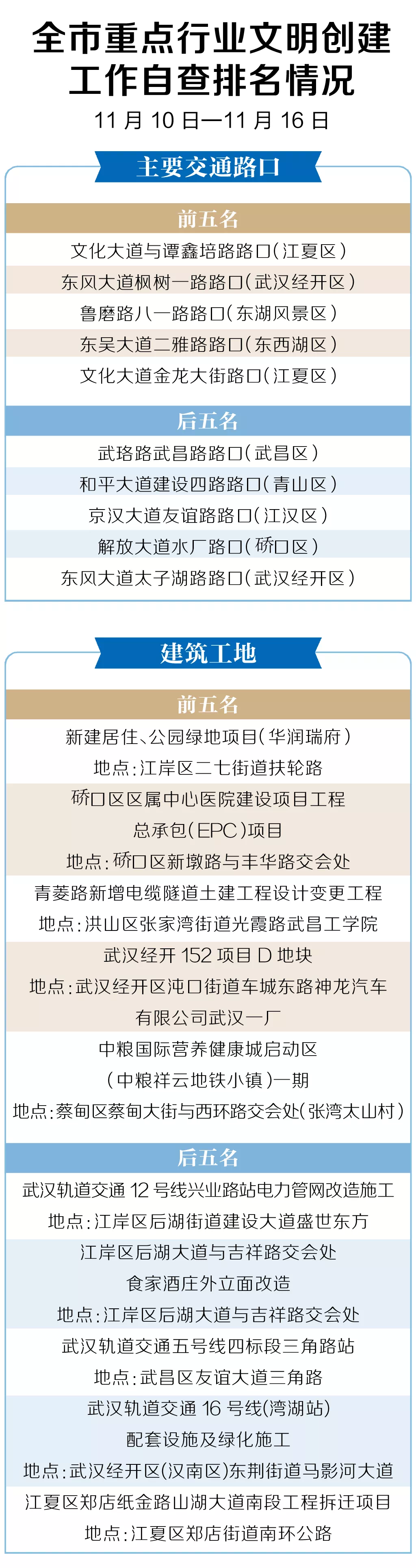 11月21日武汉市文明办通报近期全市重点行业文明创建工作自查排名情况其中文化大道与谭鑫培路口新建居住、公园绿地项目(华润瑞府)晴川街-汉水公寓路等12个点位分别排名排名前列