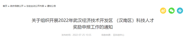 7月27日消息,搜狐焦点获悉,日前,武汉经开区人民政府官网发布《关于组织开展2022年武汉经济技术开发区 (汉南区)科技人才奖励申报工作的通知》(以下简称《通知》)。《通知》明确申报对象,申报条件,申报期限,以及奖励标准。详情如下:
