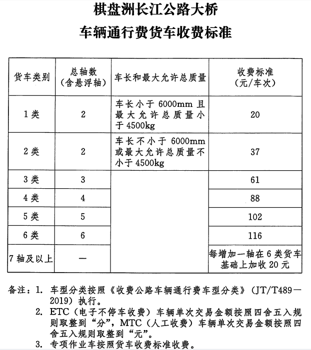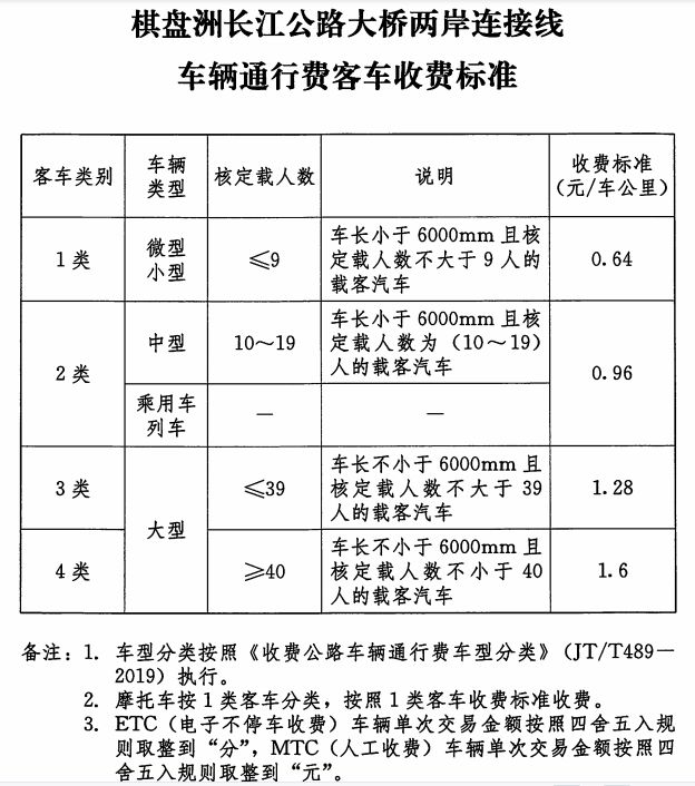 按照《收费公路管理条例》和我省有关规定,棋盘洲长江公路大桥车型分类收费标准按1类客车15元/车次档,1类货车20元/车次档执行;棋盘洲长江公路大桥两岸连接线车型分类收费标准按1类客车0.64元/车公里档,1类货车0.5元/车公里档执行。