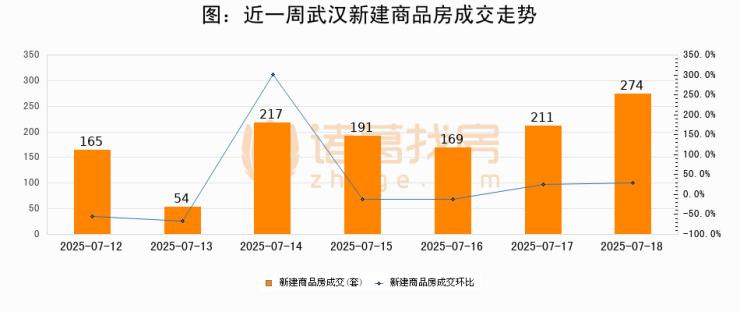 根据武汉市住房保障和房屋管理局数据显示,2025年07月18日武汉新建商品房成交274套,较昨日增加63套,环比上涨29.9%