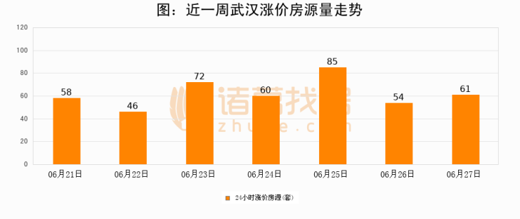 根据诸葛找房数据显示,武汉24小时涨价房源量为61套,较06月26日增加7套,环比上涨13%。与此同时,涨价房源占比小幅扩大,业主信心有所提升。