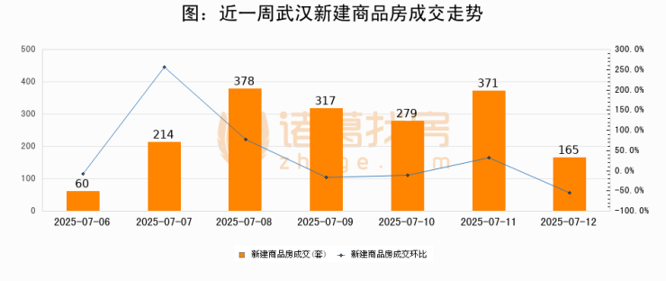根据武汉市住房保障和房屋管理局数据显示,2025年07月12日武汉新建商品房成交165套,较昨日减少206套,环比下降55.5%
