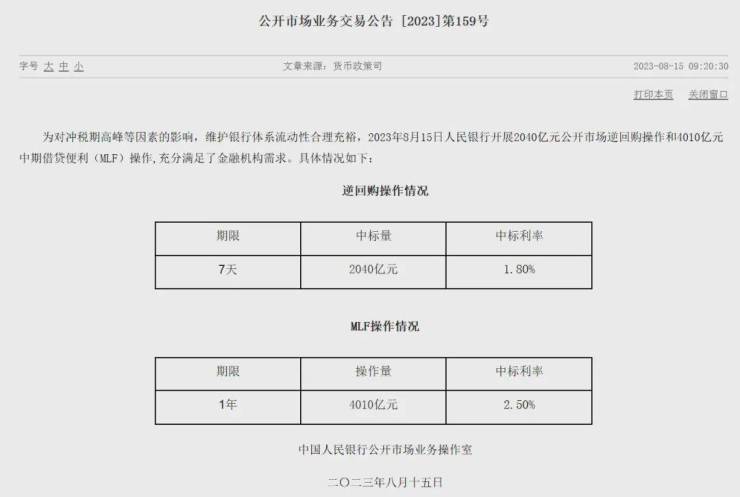 搜狐焦点获悉,早上九点二十分,中国人民银行发布公告表示,当日开展4010亿元1年期中期借贷便利(MLF)操作和20亿元7天期公开市场逆回购操作,中标利率分别为2.5%、1.8%,均较前次操作分别下降15和10个基点。