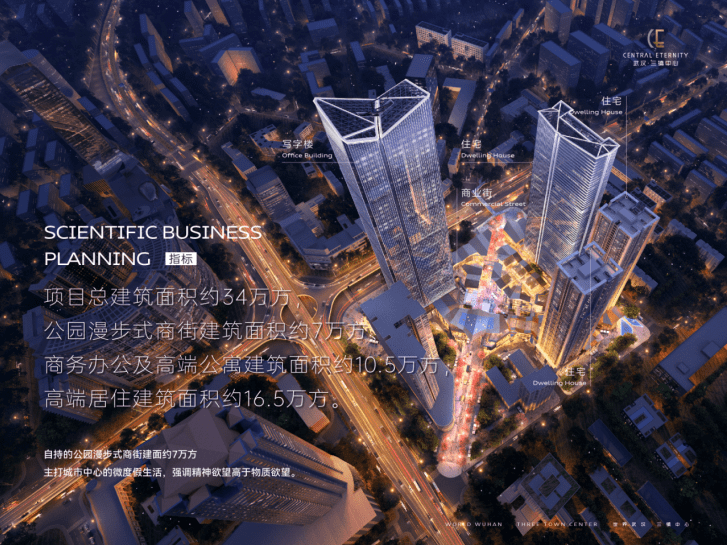 项目总建筑面积约34万方,公园漫步式商街建筑面积约7万方、商务办公及高端公寓建筑面积约10.5万方,高端居住建筑面积约16.5万方,力图革新武汉十字正心传统商业高密度、快节奏的单一体验现状,弥补城市都心慢消费空白区域,打造集“全球商务办公、都市微度假体验、中心高端生活”于一体的城市中心商旅度假地。