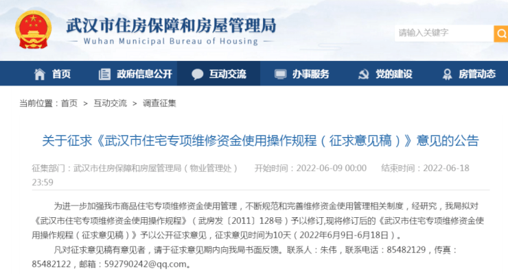 6月15日消息,搜狐焦点获悉,2022年6月9日,武汉房管局发布关于征求《武汉市住宅专项维修资金使用操作规程(征求意见稿)》意见的公告。