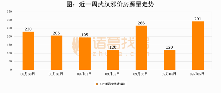 根据诸葛找房数据显示,武汉24小时涨价房源量为291套,较09月04日增加171套,环比上涨142.5%。与此同时,涨价房源占比小幅扩大,业主信心有所提升。