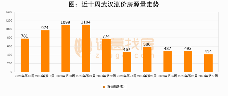 从调价房源来看,第27周武汉涨价房源414套,较上周下降15.9%。与此同时,27周涨价房源占比回落0.77个百分点,业主信心小幅波动,购房者可则需入市。