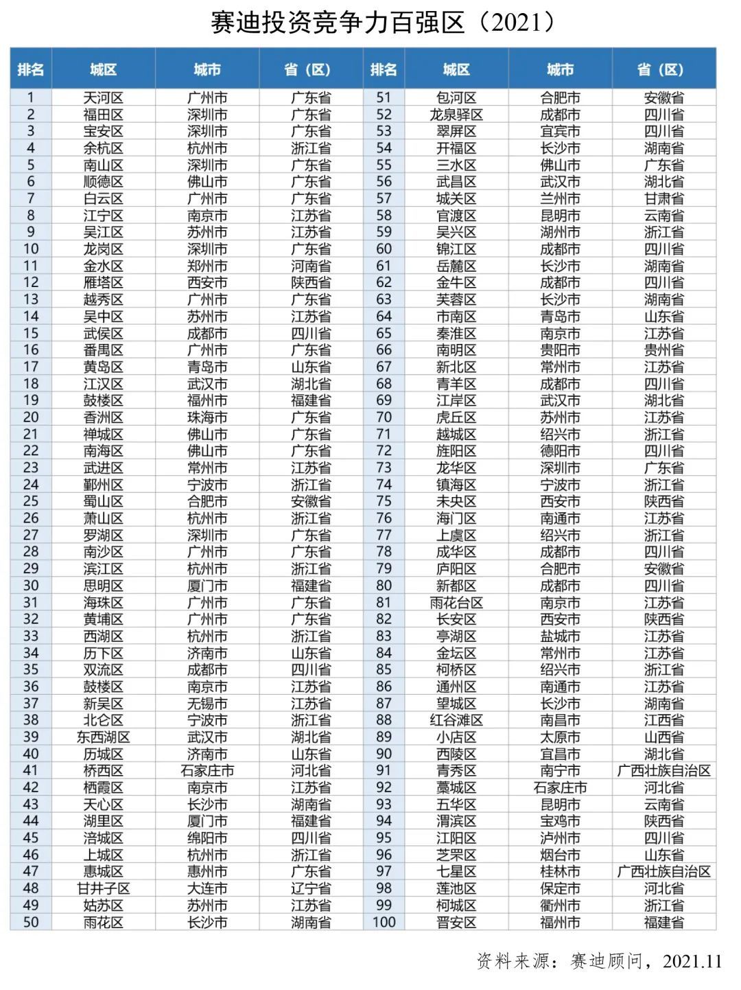 《投资百强区》显示,上榜城区TOP10分别是广州市天河区、深圳市福田区、深圳市宝安区、杭州市余杭区、深圳市南山区、佛山市顺德区、广州市白云区、南京市江宁区、苏州市吴江区、深圳市龙岗区。全部位于东部地区,广东省拿下7席,其中深圳有4个城区入列。 另外,郑州市金水区、西安市雁塔区、广州市越秀区、苏州市吴中区、成都市武侯区、广州市番禺区、青岛市黄岛区、武汉市江汉区、福州市鼓楼区、珠海市香洲区也进入上榜城区TOP20,上述城区仅有4个来自中西部地区。 粗略统计,投资竞争力百强区拥有量TOP10城市为成都(8个)、广州(7个)、深圳(6个)、长沙(6个)、杭州(5个)、南京(5个)、武汉(4个)、佛山(4个)、苏州(4个)、宁波(3个)、绍兴(3个)、常州(3个)、西安(3个)、合肥(3个)(注:宁波、绍兴、常州、西安、合肥并列第10,故上榜城区拥有量TOP10城市有14个)。 前不久,赛迪顾问城市经济研究中心曾发布“2021年赛迪百强区”,若将两份榜单对比看来,也能看出各个城市的发展势头和潜能。