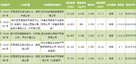上两周(9.24-10.7)武汉招拍挂市场共成交5宗住宅地块,合计成交建面约86.4万方,合计成交金额约36.75亿元。其中,3宗地块底价成交,另外2宗东西湖地块溢价率不超过0.64%。东西湖临空港三宗地分别被武汉临空港投资集团、北京首开和武汉水务集团拿下,新洲阳逻两宗地块分别被中建三局和湖北铁投大桥地产竞得。