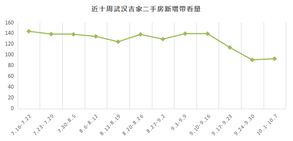 9月最后一周(9.24-9.30)武汉吉家新增带看量环比下降20.31%,提前进入假期模式。国庆黄金周(10.1-10.7)带看量小幅回升2.39%。