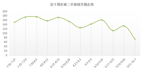 9月最后一周(9.24-9.30)武汉吉家二手住宅交易量环比上涨19.4%。国庆黄金周(10.1-10.7)成交量受节假日影响,大幅下降45%。
