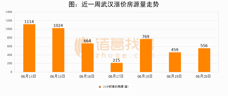 根据诸葛找房数据显示,武汉24小时涨价房源量为556套,较06月19日增加97套,环比上涨21.1%。与此同时,涨价房源占比小幅扩大,业主信心有所提升。