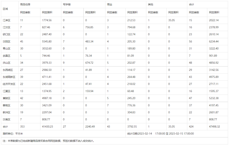 根据武汉市住房保障和房屋管理局数据显示,2023年02月15日武汉新建商品住房网签成交353套, 较昨日减少90套,环比下降20.3%。