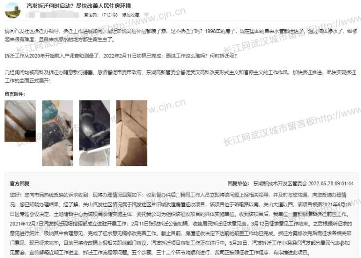 东湖新技术开发区管委会:经了解,关山汽发社区情况属于汽发社区片旧城改造房屋征收项目,该项目位于珞喻路以南,关山大道以西,该项目根据2021年6月18日区专题会议决定,土地储备中心为该项目收储实施主体,委托我公司为组织该征收项目的具体实施单位。收到该项目后,我单位一直积极准备拆迁前置工作。2021年12月7日汽发拆迁现场指挥部成立进驻开展工作;2月11日张贴拆迁公告初稿,收集居民拆迁征求意见表,3月12日征求意见工作结束。之后根据所征求的意见进行统计、吸纳其中合理意见,完成了征求意见稿修改完善工作。截止目前,房屋征收决定下达前的前置工作均已完成。拆迁方案修改完后需征求各相关部门意见,现已征求完毕。目前已将修改稿上报相关职能部门审议,汽发拆迁项目审批工作正在进行中。5月20日,汽发拆迁工作小组组织汽发部分居民代表参加见面会,宣传解释近期工作进度、拆迁工作流程等问题。五个步骤、三十二个环节均顺利进行,我司正按照征收工作程序,有序推进此项目。