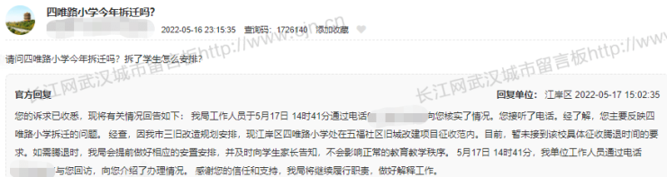 江岸区:经查,因我市三旧改造规划安排,现江岸区四唯路小学处在五福社区旧城改建项目征收范内。目前,暂未接到该校具体征收腾退时间的要求。