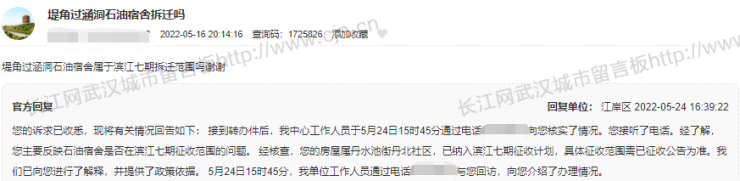 江岸区:经了解,您主要反映石油宿舍是否在滨江七期征收范围的问题。经核查,您的房屋属丹水池街丹北社区,已纳入滨江七期征收计划,具体征收范围需已征收公告为准。