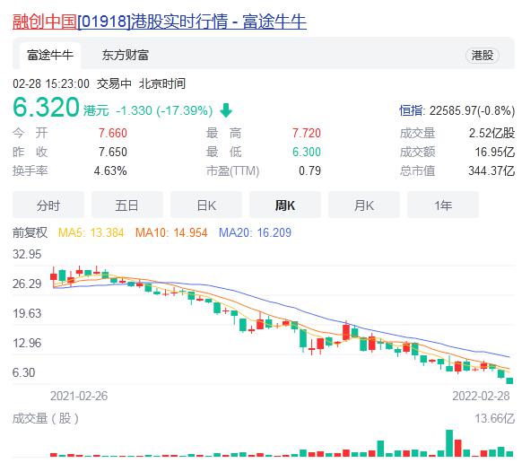 截至发稿前,融创中国港股股价重挫 17.25%,实时股价为 6.33 港元。这是进入 2022 年以来,融创港股跌的最惨的一次。
