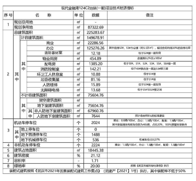 项目124C2地块(一期)为商业服务业设施用地,位于经开区通顺河大道以东,紧邻159R2地块,用地面积87322.69平方米,计容建筑面积149678.91平方米,规划4栋20-25层办公楼(含公共配套),43栋2层商业街(含公建配套),1栋1层商业专变,1栋1层垃圾收集站、商业专变及环卫工人休息室,整体地下一层局部二层,地下室机动车位2024辆。