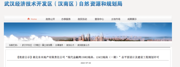 7月27日消息,搜狐焦点获悉,近日,武汉经济技术开发区(汉南区)国土资源和规划局发布,湖北东木地产有限责任公司“现代金融湾159R2地块、124C2地块(一期)”总平面设计及建设工程规划许可批前公示。