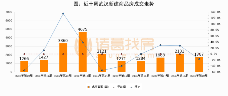 进入2025年第19周(05月05日-05月11日),武汉新建商品房成交1767套,较上周减少364套,环比下降17.1%