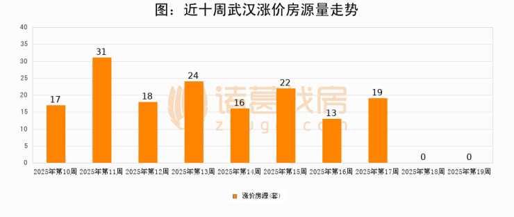 从调价房源来看,第19周武汉涨价房源0套,较上周持平。与此同时,19周涨价房源占比回落100个百分点,业主信心小幅波动,购房者可则需入市。