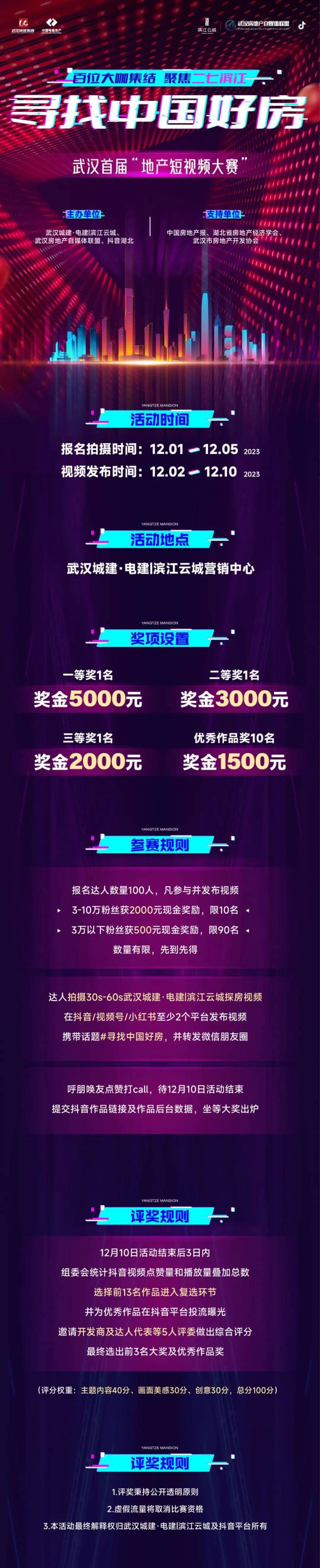 大赛将甄选100名达人进行短视频拍摄,以“武汉城建·电建|滨江云城”为主题摄30s-60s探房视频。