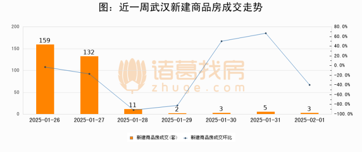 根据武汉市住房保障和房屋管理局数据显示,2025年02月01日武汉新建商品房成交3套,较昨日减少2套,环比下降40%