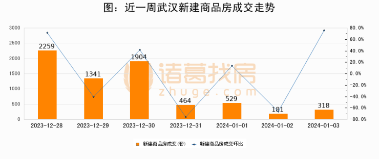 根据武汉市住房保障和房屋管理局数据显示,2024年01月03日武汉新建商品房成交318套,较昨日增加137套,环比上涨75.7%