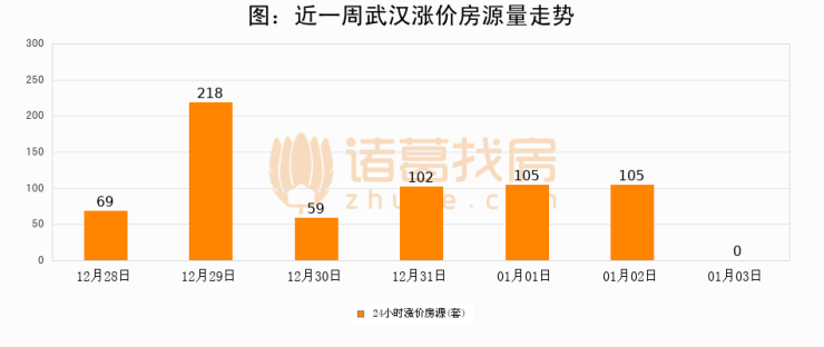 根据诸葛找房数据显示,武汉24小时涨价房源量为0套,较01月02日减少105套,环比下降100%。与此同时,涨价房源占比小幅回落,对于购房者来说是一个入市窗口期,购房者可抓住时机入市。