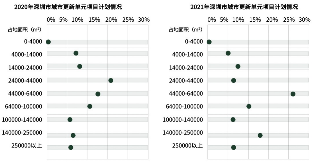 以市场成熟度以及立法完成度较高的深圳为例, 2018—2021年间,拆除重建项目无论是单项目体量或是计划数量都存在明显的增长趋势。其中,18年至20年3年内项目计划量以54%的年均复核增速增长至105幅。此外,21年上半年计划量达到58幅,高于去年同期水平。在单项目体量上,18年深圳城市更新出让项目的占地面积集中于0.4-1.4万方,经过3年的城市发展,至21年,供应的项目规模提高,集中在2.4-4.4万方,其中超25万方大体量项目占比以年均9%递增。