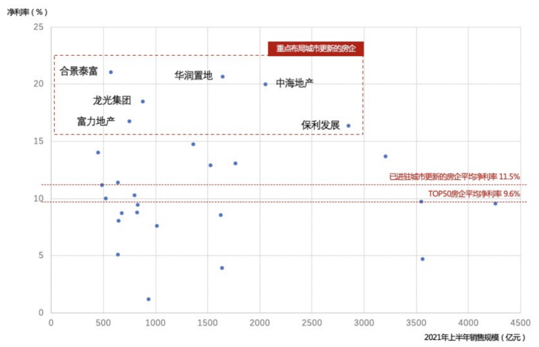 其中重点布局城市更新业务的5家房企,包括龙光、富力、华润、中海、合景泰富,2021年上半年净利率皆在16%以上,远高于行业平均净利率9.6%。城市更新对于房企而言,已上升到重点战略的层面。