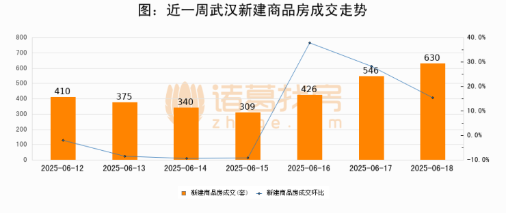根据武汉市住房保障和房屋管理局数据显示,2025年06月18日武汉新建商品房成交630套,较昨日增加84套,环比上涨15.4%