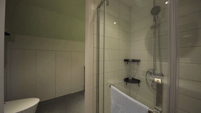将客厅延伸出来的位置作为洗手池和淋浴房,书房拓宽出来的位置则变成洗衣区,剩余部分为马桶间和储物间。