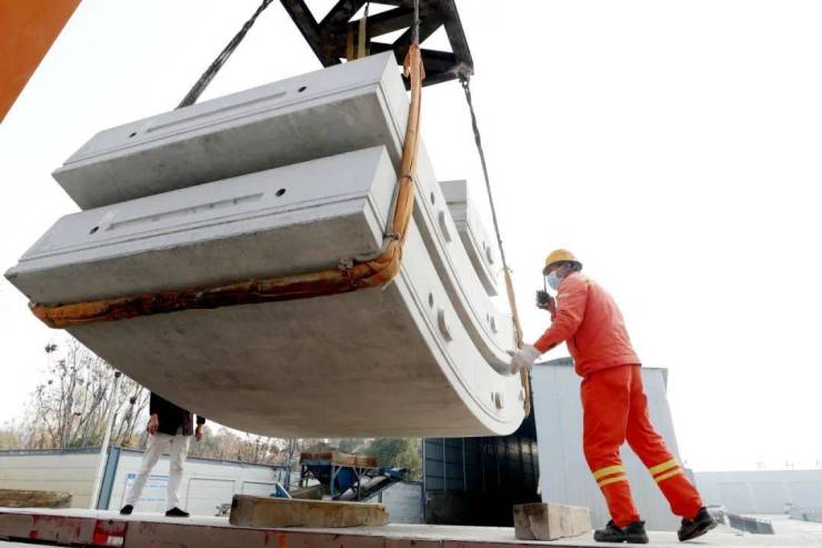 ▲地铁12号线国博中心南站至凌吴村站越江隧道盾构工点,施工人员吊装管片。