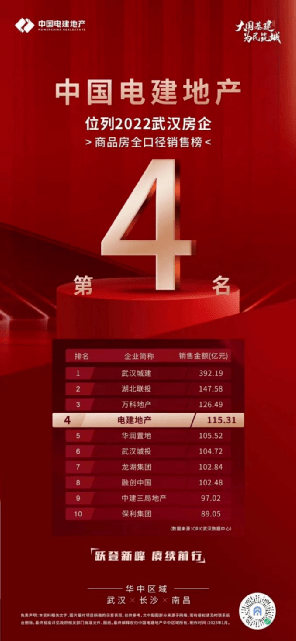 在湖北武汉,中国电建地产也一直深受购房者的信任与喜爱。据克而瑞数据显示,2022年中国电建地产名列武汉房企销售榜第4,成为武汉楼市名副其实的“中流砥柱”。