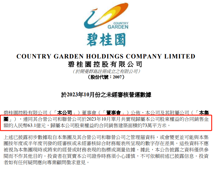 根据碧桂园在港交所公告的最新销售数据,10月单月,碧桂园共实现归属公司股东权益的合同销售金额约63.1亿元,归属公司股东权益的合同销售建筑面积约73万平方米。