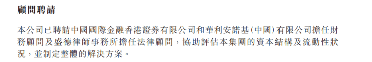 对于债务化解,10月10日,碧桂园发布公告称,将积极推进境外债务管理措施,公平公正地制定整体解决方案来实现长期、可持续的资本结构。公司已聘请中国国际金融香港证券有限公司和华利安诺基(中国)有限公司担任财务顾问及盛德律师事务所担任法律顾问,协助评估公司的资本结构及流动性状况,并制定整体的解决方案。
