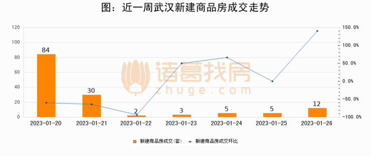 根据武汉市住房保障和房屋管理局数据显示,2023年01月26日武汉新建商品房成交12套,较昨日增加7套,环比上涨140%