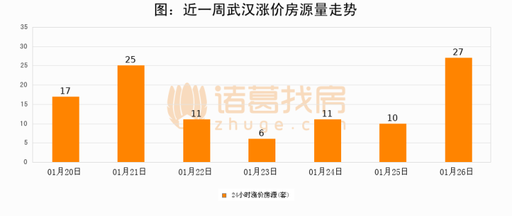 根据诸葛找房数据显示,武汉24小时涨价房源量为27套,较01月25日增加17套,环比上涨170%。与此同时,涨价房源占比小幅扩大,业主信心有所提升。
