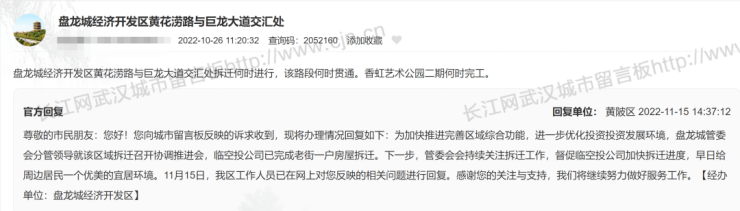 问:盘龙城经济开发区黄花涝路与巨龙大道交汇处拆迁何时进行,该路段何时贯通。