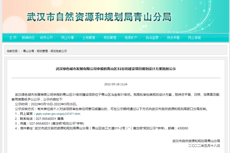 该项目位于青山区冶金街31街坊,由武汉绿色城市发展有限公司申报。