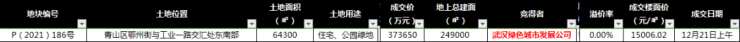 2021年12月,武汉绿色城市发展有限公司以底价37.365亿,竞得P(2021)186号地块,成交楼面价15006.02元/平。