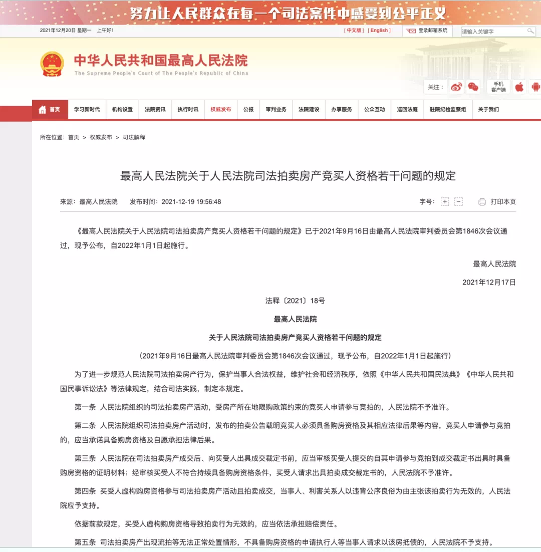 12月20日消息,搜狐焦点获悉,19日,较高人民法院在其官网发布了《关于人民法院司法拍卖房产竞买人资格若干问题的规定》,这一《规定》于今年9月份由较高人民法院审判委员会第1846次会议通过,明年1月1日起施行。
