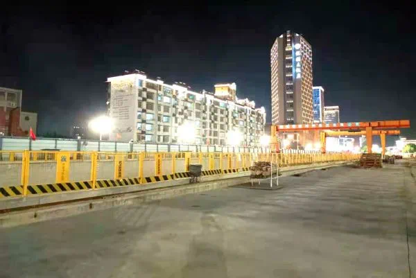 走进黄陂广场站,只见地面干净整洁,施工标识安放醒目,工程物品、材料码放有序,多台大型机械同步作业情况下,工地却显得并不嘈杂。项目部进场之初,就确立了“把对周边影响降至较低”的原则,定期走访周边工作单位和居民小区,收集意见并及时整改;打造绿色工地,布置“三棚一帘”;合理安排作业时间,定时洒水降尘。为了实现安静施工,项目部在场内设置50多米长的隔音声屏障,减小施工机械产生的噪声。