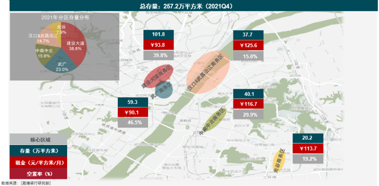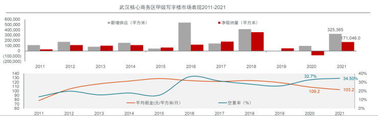 2021年, 恒隆中心、泛悦城T2、中海中心和首地财富中心的集中入市为武汉甲级写字楼带来约32.5万平方米的优质新增供应,推动全市优质甲级写字楼存量至257.2万平方米。优质新项目的集中入市导致短期内市场整体空置率爬升,截至2021年四季度末武汉核心商务区优质甲级写字楼市场整体空置率34.5%同比去年末升高约1.8个百分点。
