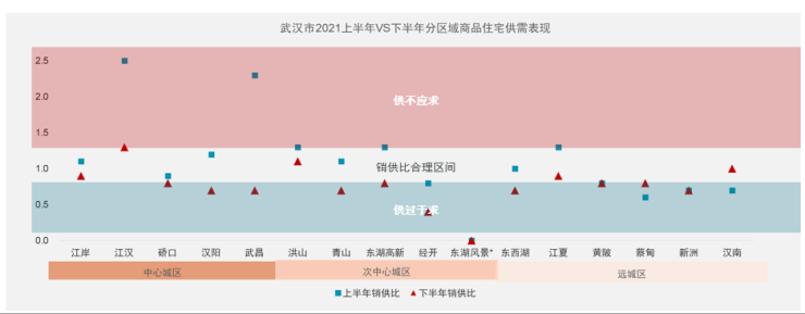 对比2021年上半年和下半年各个区域的销供比:虽然大部分区域仍处于销供比的合理区间(0.8~1.2),但下半年大部分区域的销供比都有所下降。上半年中心城区引领武汉市房价上涨的趋势没有变,但受金融贷款管控对下半年市场的影响,全年来看大部分区域价格涨幅较上半年持平或收窄。全年持续领涨的区域主要集中在核心城区,江岸、硚口、武昌及青山。整体来看,武汉市住宅出清周期在2021年显示出明显的上升趋势,需求释放显著放缓。预计随着新一年的到来,金融机构贷款额度的恢复,2022年上半年需求释放或将有所加快。