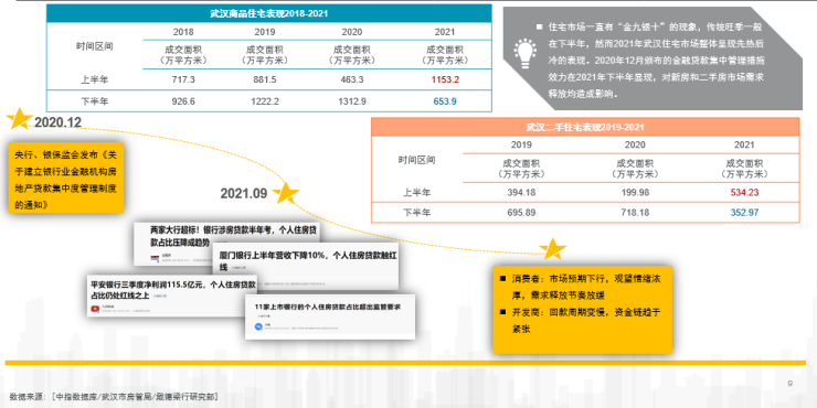 截至2021年11月武汉市商品住宅成交均价较2020年末上涨约6.2%。住宅市场一直有“金九银十”的现象,传统旺季一般在下半年,然而2021年武汉住宅市场整体呈现先热后冷的表现。2020年12月颁布的金融贷款集中管理措施效力在2021年下半年显现,对新房和二手房市场需求释放均造成影响。