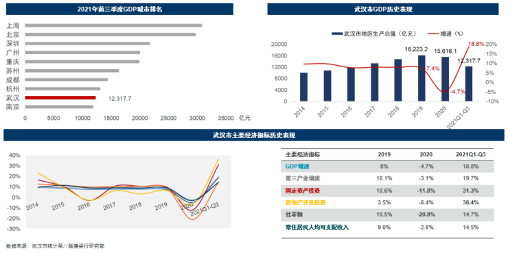 2021年前三季度,武汉市经济社会发展保持加快恢复、质效提升、稳中向好态势。前三季度武汉市地区生产总值12317.7亿元,比上年同期增长约18.8%,全国排名第九位。主要经济指标都出现同比快速增长,其中固定资产投资和房地产开发投资分别同比增长31.3%和36.4%。消费市场持续回暖,前三季度社会消费品零售总额4577.9亿元,同比去年增长14.7%.
