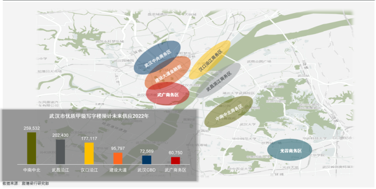 展望2022年,武汉核心商务区甲级写字楼市场预计还将迎来包括武汉天地A1、华润置地大厦T1、香港中心A座等在内的优质办公空间的集中交付。其中52.0%的优质办公空间将供应于汉口&武昌沿江商务区,预计短期内该商务区空置率将有所上升,租金承压。