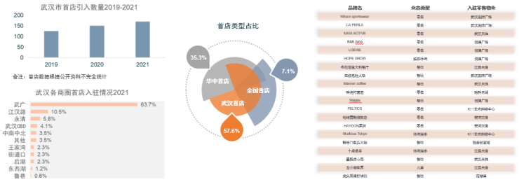 2021年,武汉首店引进数量创新高,分别较2019和2020年增加约36.8%和13.2%,首店经济持续发力。分商圈来看,2021年首店引入最为积极的商圈集中于汉口片区,武广、江汉路、永清及CBD商圈合并占到全年首店引入数量的超80%。